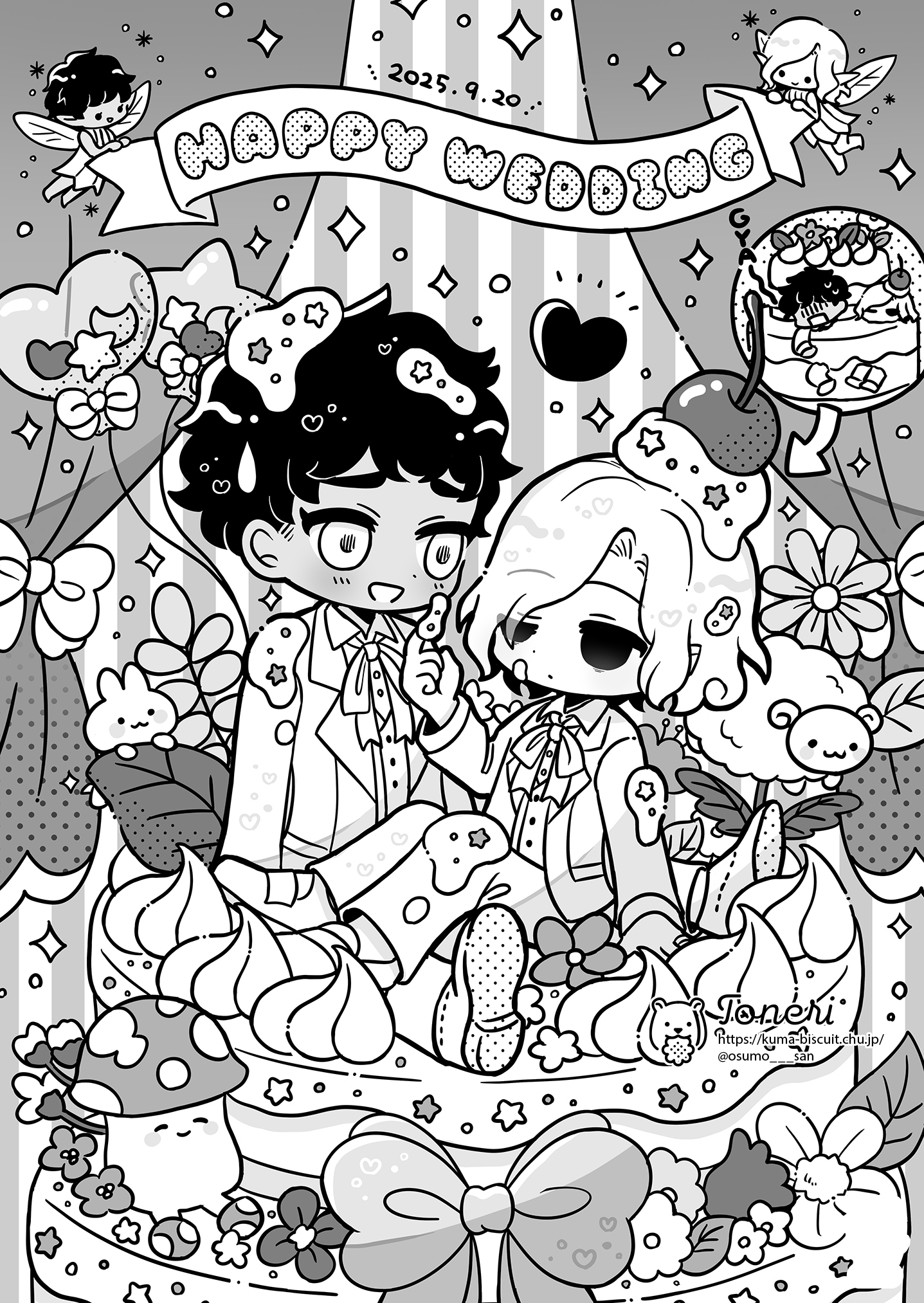 2025年9月20日に行われたカブミス結婚式のアンソロジーに寄稿させていただきました。転移術失敗ウェディングケーキです。白黒だけどカラフルに感じると言っていただけてすごく嬉しかった思い出…